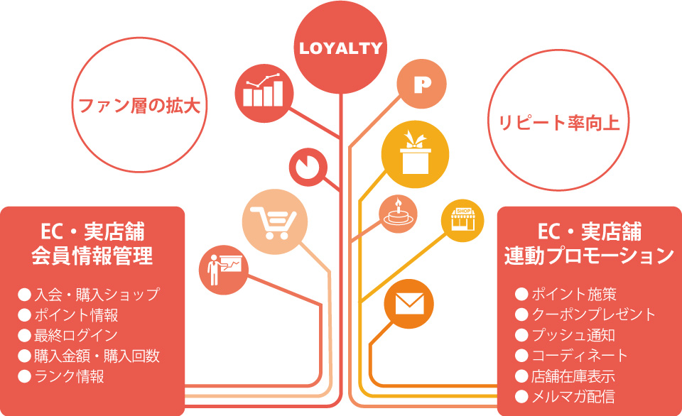 どのようなお客様が、どの店舗でどんなお買い物をなさったのか。仮会員のままお買い物をされているのか、会員になった上でどうポイントを利用なさっているのか。アプリのプッシュは閲覧しているのか、そこからのアプリ会員訪問数はいつもと違ってどう増えたのか。そういった会員・顧客に関するあらゆる情報を適切に取得し、施策に活かせるようにすることで「ショップやブランドのファンを作る」。そのための会員管理・顧客管理機能となっております。